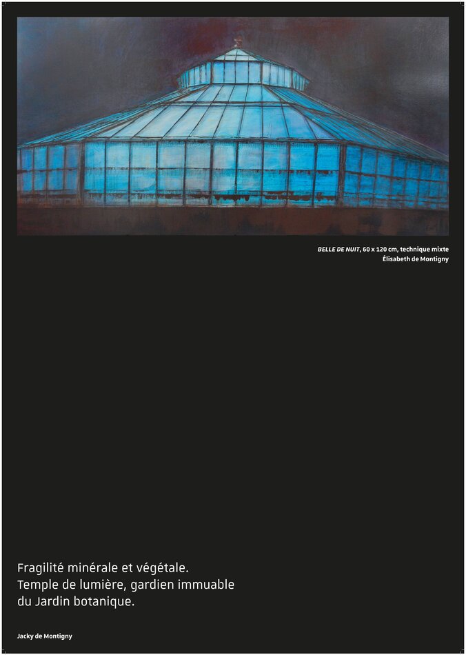 La rencontre de l’artiste peintre Élisabeth de Montigny avec ce lieu de science, aboutit à « Regards croisés sur le bâti », une exposition art et science qui caresse l’espoir que le public du Jardin finira aussi par porter un regard clément sur ces serres rouillées qui jadis furent clinquantes et techniquement avancées, et sur cette architecture étonnante, l’Institut, qui, dans le temps, fut à la pointe de la technologie et curieusement inspirée d’un bactériophage.