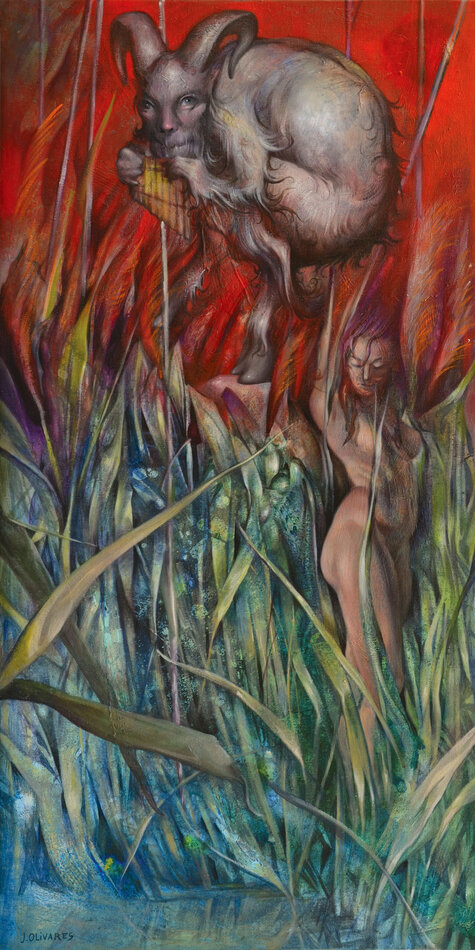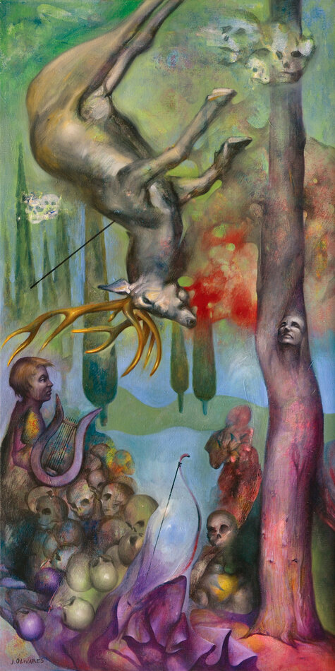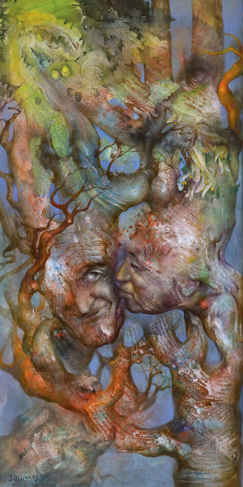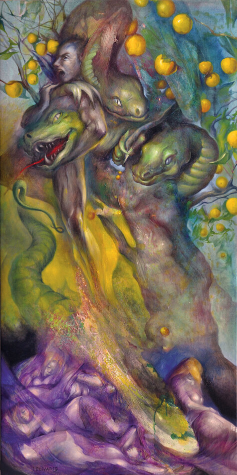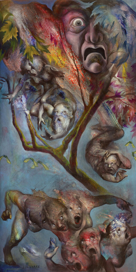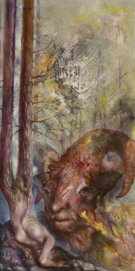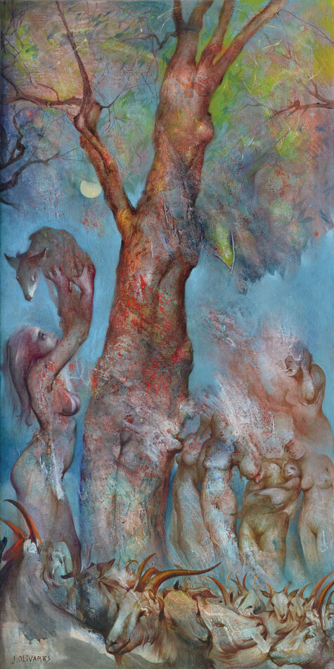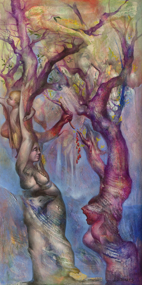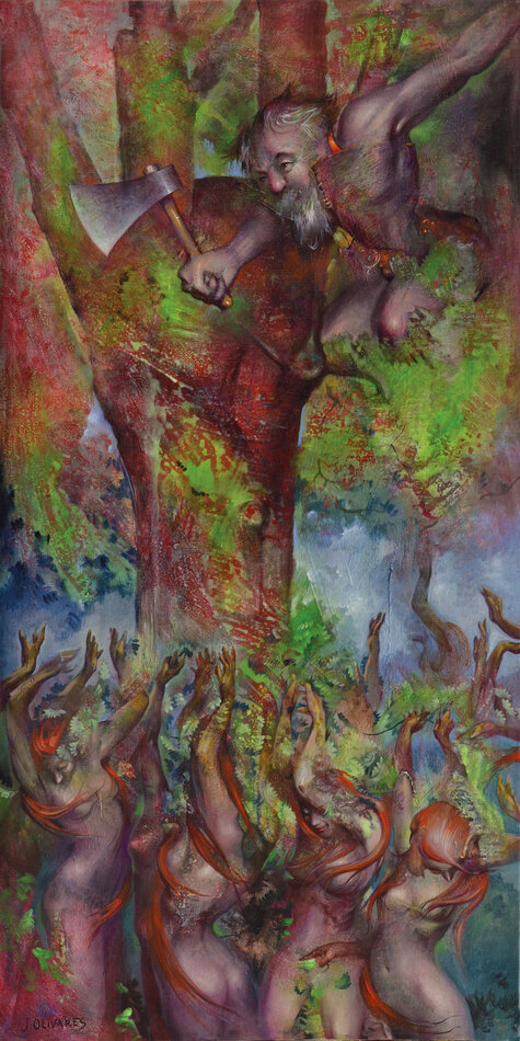 Pour le nouvelle saison culturelle du Jardin consacré au thème de l'arbre, son regard de peintre se prête à l’interprétation de vingt mythes en lien avec vingt arbres de l’arborétum. Ses peintures, conçues avec une technique mixte dans un format qui rappelle la verticalité des troncs (146 x 73 cm), s’inspirent de la richesse plastique des ligneux, de leurs rythmes, de leurs formes, de leurs ombres et lumières, de leurs texture, écorce, bois, feuille… ainsi que des hommes et des dieux, de leurs amours, de leurs forces et faiblesses, de leurs corps…