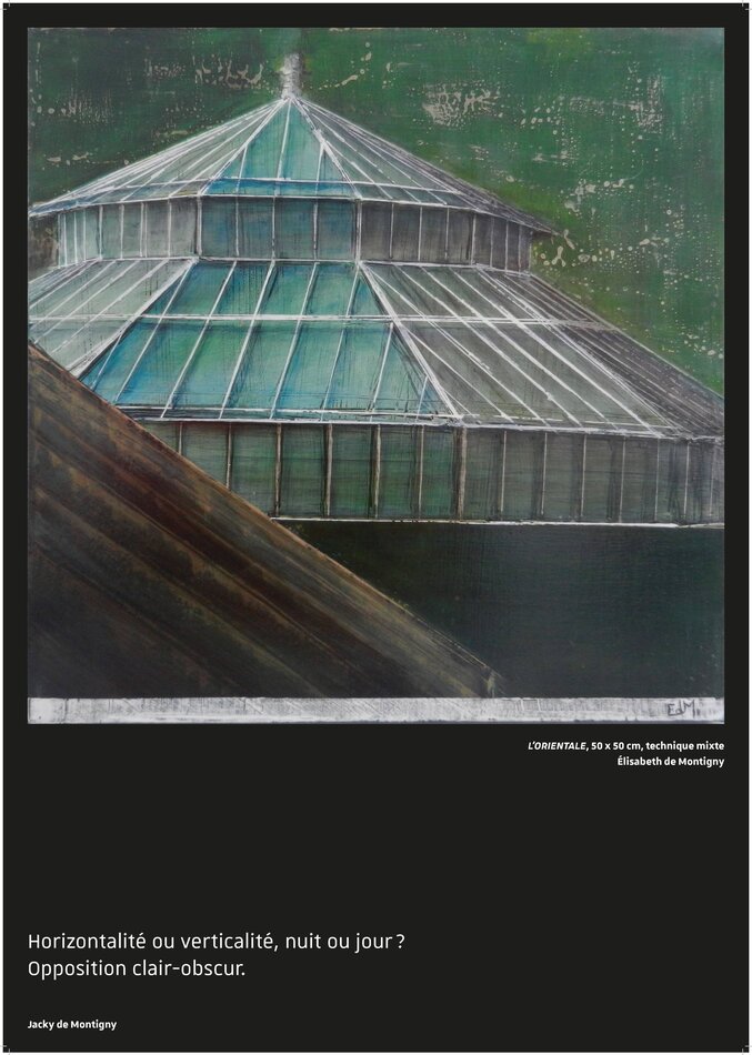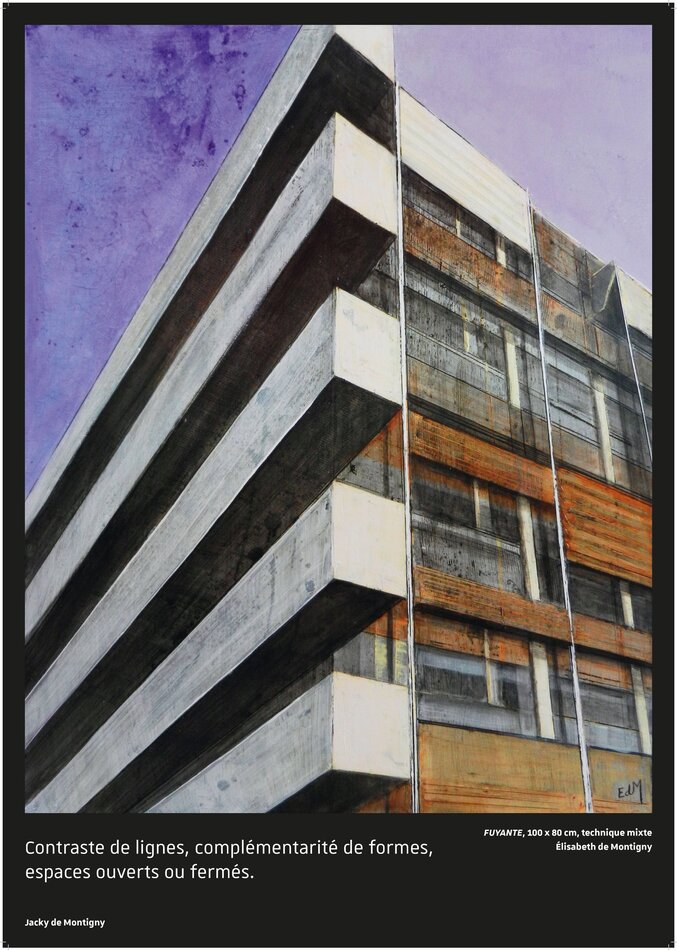 inesthétique. Pourtant, le potentiel poétique de cet ensemble de verre et d’acier est indéniable, et, s’il a inspiré la sensibilité de l’artiste contemporaine Élisabeth de Montigny, c’est certainement que, depuis sa position externe et de plasticienne, elle a été frappée, amusée puis charmée par ses paramètres visuels et esthétiques comme les lignes, les rythmes, les textures, les matières, les perspectives, les couleurs.
