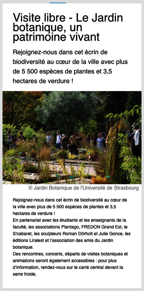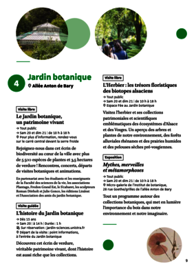 - AAJBUS : l'Association des amis du Jardin botanique de l'Université de Strasbourg créée y a plus de 40 ans soutient le Jardin Botanique dans ses actions. Venez les rencontrer et découvrez leurs activités. (Samedi et dimanche de 10h à 18h, carré central).