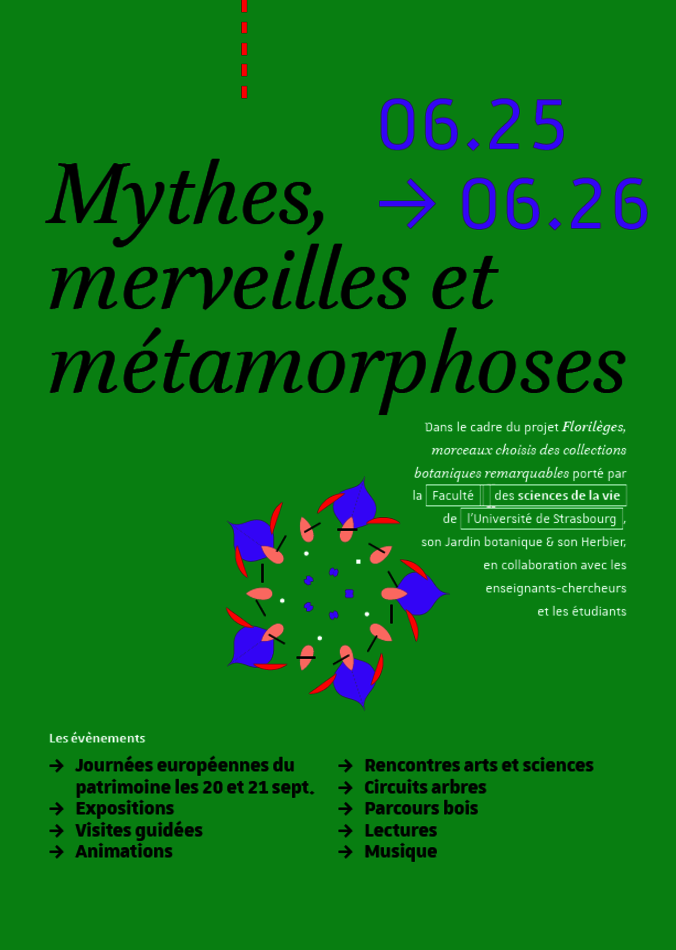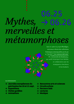 - Visite guidée « Arbres et Mythes » : Partez à la découverte des légendes et métamorphoses végétales, à travers un parcours art et science le long de l’allée Anton de Bary. (Samedi et dimanche à 13h30 et 16h00, départ point accueil carré central.) (textes de l'exposition à télécharger)