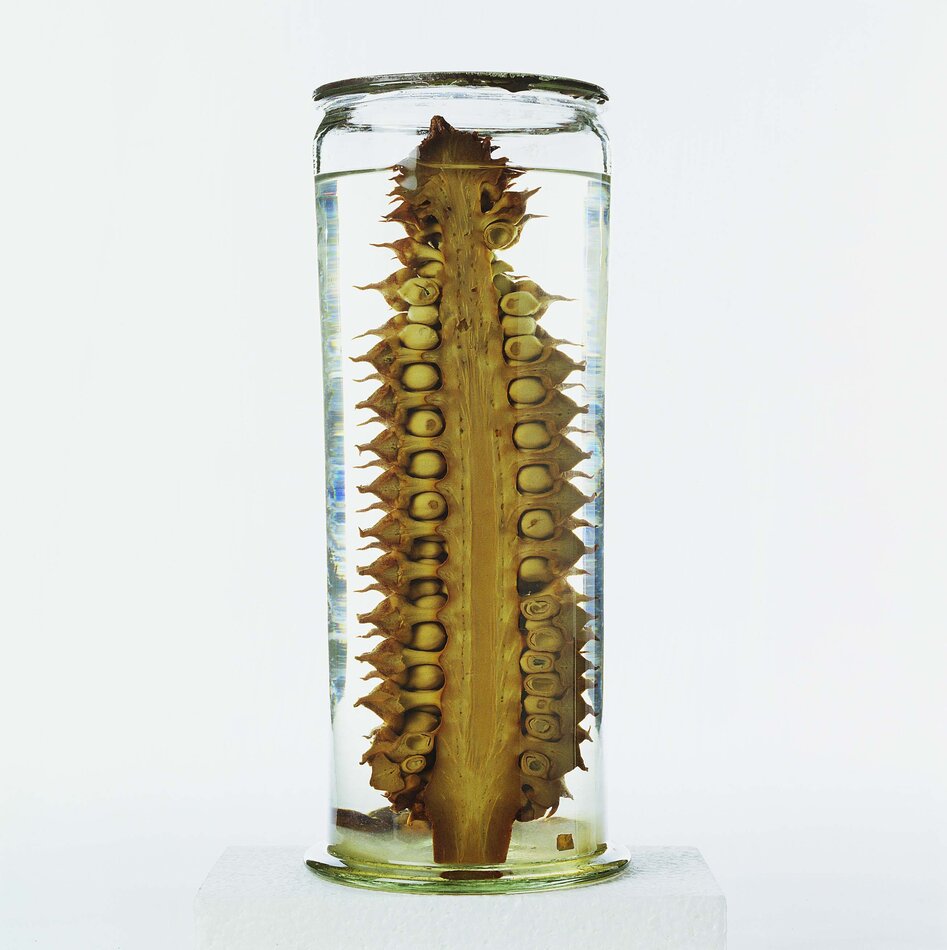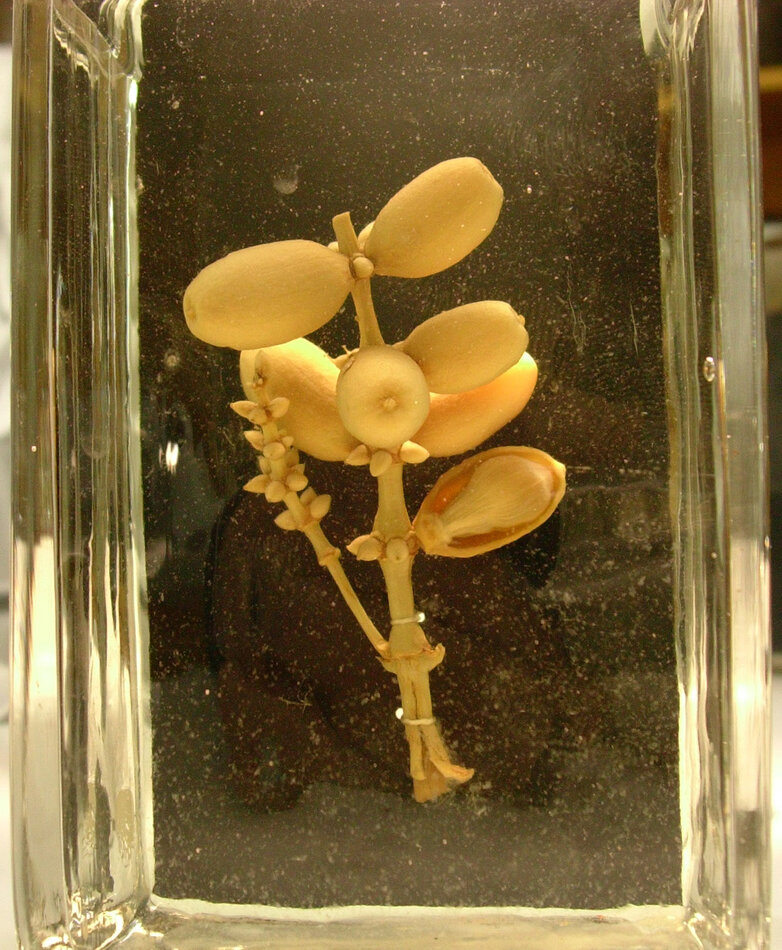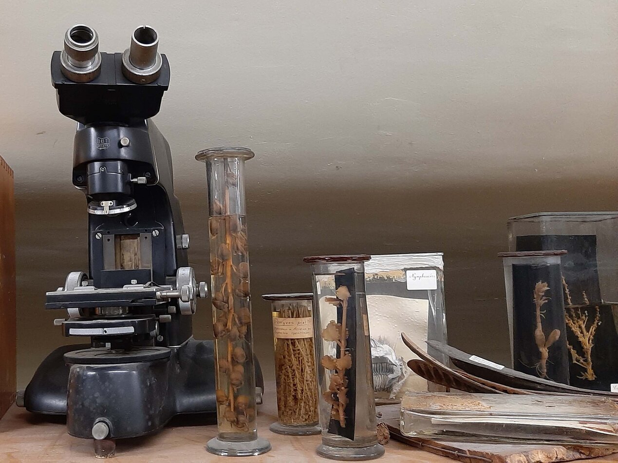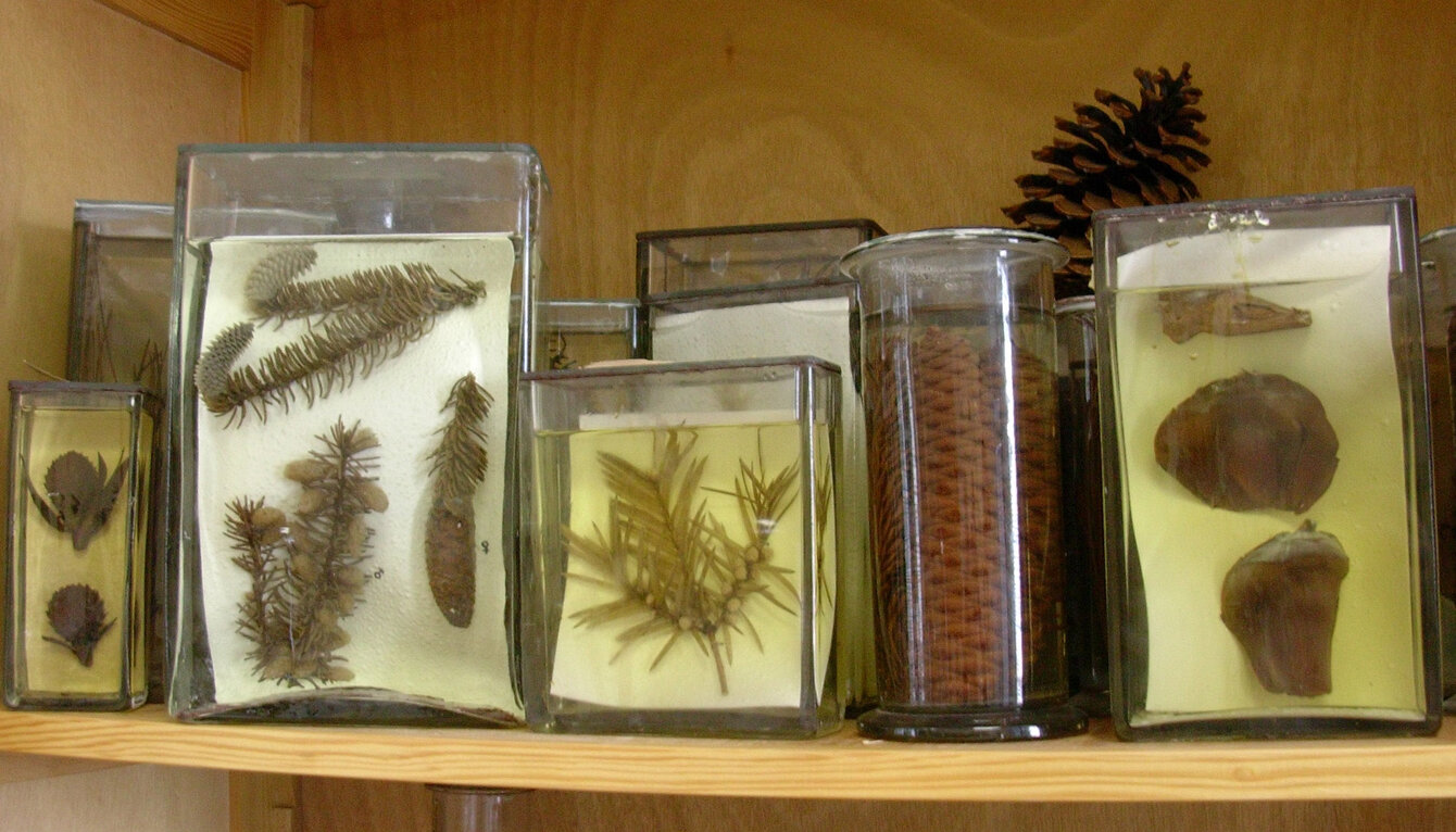 - Des échantillons de plantes, fruits, graines conservés dans l'alcool dans des contenants en verre.