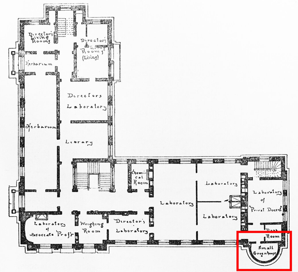 Enfin, un petit jardin destiné aux cultures expérimentales est aménagé à l’extérieur, entre les deux ailes de l’Institut.
